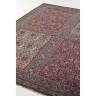 Kirman noué à la main au sud-est de la Perse vers 1940 Chaîne et trame coton, velours laine 5,00 × 3,70 m Le champs est composé de quatre compartiments rectangulaires rouge pourpre et voire, ornés d’un motif répétitif de palmettes stylisées et de rinceaux fluris, organisés en bandes horizontales. Chaque compartiment est cerné d’un galon aune à guirlandes de flurs. La bordure principale bleu vif séparant chaque compartiment et les encadrant, est ornée d’une guirlande à succession de biches et volatiles et de palmettes stylisées. elle est cernée d’une contrebordure jaune à guirlande de flurs. Bel état de conservation