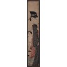 Kitagawa Utamaro ( 1753? - 1806) Hashira-e, oiran debout vêtue d'un kimono noir avec obi rouge, sa kamuro agenouillée près d'elle tenant un plateau. Non signée. ( Taches, pliures) 59 x 10.5 cm. Encadré sous verre.