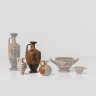 Lécythe à fiures noires peint d’un homme assis (Dionysos ?) entre trois satyres. terre cuite vernissée noir et rehauts de peinture rouge (Accidents) Attique, fin du VIe siècle av. j.-C H 13 cm Acquis en 1966
