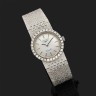 Montre bracelet de dame en or gris 18k, 750‰ cadran rond, lunette sertie de diamants. Tour de bras souple en or gris satiné.