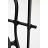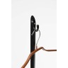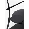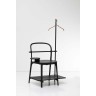 Normal Studio Valet de nuit Bois teinté, cordelette et cintre, 134 x 65 x 50 cm. “Nous avons souhaité détourner l’usage de la chaise en s’appuyant sur le dessin sophistiqué et délicat de sa structure. Elle devient valet de nuit. 3 plateaux en bois de tailles différentes et un mât remplacent l’assise et accueillent vêtements, chaussures et objets. L’ensemble est monochrome, noir comme le piètement de la chaise. Les différents éléments liés par des cordelettes maintiennent les assemblages. L’usage est simple et évident, domestique.”