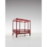 Lit à baldaquin en orme sculpté et mouluré laqué rouge, clos sur trois côtés par une galerie à décor d'entrelacs stylisée et en façade ceint à moitié d'une galerie à décor géométrique, le chapiteau orné de branchages fleuris et cartouches ajourés reposant sur six montants, reposant sur quatre pieds