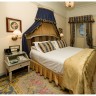 Lit en bois laqué blanc rechampi bleu 115 X 184 cm et deux chevets 60x50X45cm et petite table rectangulaire et rideaux et couvre lit...