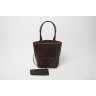 CABAS "GLOBE" en cuir lisse chocolat bordé noisette, garnitures en métal argenté, pochette amovible
