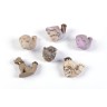 Lot de six foyers en biscuit. Allemagne, Thuringe : -deux têtes de jeune fille (blanc et rose). -femme au chapeau polychrome et or. -tête de hibou (yeux en verre décollés). -tête de mort. -chien assis en terre grise. Monture laiton