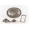 Lot en argent comprenant : plat à décor de feuillage (poids : 724 g.), pot à sucre couvert ( poids : 231 g.), pot ( poids : 133.6 g.), et cadre ( poids : 124. 6 g.). Travail dans le goût indochinois.