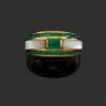 * MELLERIO, modèle "Titus". Bague en or jaune 18 k (750°/oo), ornée au centre d'une émeraude rectangulaire entre deux motifs de nacre et deux lignes de petites émeraudes rectangulaires. Signée et numérotée 5395 B. Tour de doigt : 52 Poids brut : 8,3 g