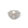 Magnifique broche "Ecusson" d'Epoque ART DECO en platine (850‰) et or jaune 14k (585‰) pour le système à décor géométrique ornée d'une perle fine de forme bouton et de diamants ronds de taille ancienne et baguette