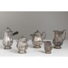 Service à thé café en argent uni monogrammé. De forme balustre à pans et côtes reposant sur un piédouche godronné, les becs verseur à motif de coquille, couvercle à bordure godronnée surmonté d'une prise en graine. Il est composé d' une théière, une cafetière manche bois noir, une verseuse, un sucrier couvert , un crémier