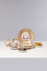 Une grande assiette, six petites, une cafetière, un pot à eau chaude, deux tasses et deux sous-tasses