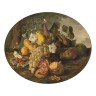 Marguerite Buret (Taverny 1841-? ) Oranges et pêches sur un entablement Framboises, grenades et corbeille de fiues Paire de toiles ovales 53,5 × 65 cm La première est signée et datée en bas à gauche M. Buret / 1862 La deuxième est signée et datée en bas à gauche Marguerite Buret / 1862