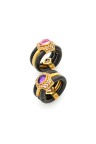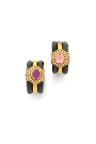 Paire de boucles d'oreilles en or jaune 18k (750‰) à trois godrons dont deux émaillés noir, ornées de cabochons de tourmaline rose et de diamants taille brillant
