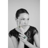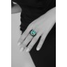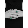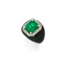 Bague chevalière de dame en or blanc 18k (750‰) émaillé noir ornée d'une émeraude octogonale taillée (7,29 carats environ) dans un entourage de diamants ronds