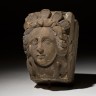 Mascaron en pierre calcaire jaune-ocre de Dom-le-Mesnil (Ardennes) sculpté en fort relief représentant une tête de femme avec coiffe à l'indienne, médaillon au-dessus du front et col festonné. Ardennes, seconde moitié du XVIIe siècle H 39 × L 29 × P 35 cm (Légères épaufrures)