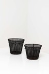 Ensemble de deux cache-pots Tôle perforée (rigitulle) laquée Modèle créé vers 1955 Grand : H 17 × Ø 19,5 cm Petit : H 14 × Ø 19 cm Bibliographie : 'Mathieu Matégot', P. Favardin, Éditions Norma, 2014, modèle similaire pp. 4-5 (annexe)