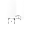 Mathieu Matégot (1910-2001) Paire de tables basses Tôle perforée laquée, métal laqué et verre Modèle créé vers 1950 H 38 × Ø 61 cm