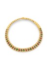 Collier articulé en or jaune 18k (750‰) à décor de losanges rehaussés de rubis, émeraudes, saphirs et de triangles sertis de diamants taille brillant