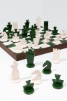 Échiquier Faïence émaillée et bois Modèle créé en 2025 Plateau: H 4×L 46×P 46cm Pièces : H (variable) 5,5/11 ×L 4,5cm