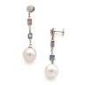 MESSIKA Paire de longs pendants d'oreilles en or gris 18k (750‰) ornés d'un diamant serti clos retenant chacun une perle de culture par une chaînette rehaussée de tourmalines rectangulaires Hauteur : 4,8 cm Poids brut : 6,9 g