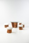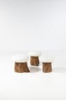 Ensemble de trois tabourets Séquoïa et textile Édition Baker Furniture Modèle créé vers 1970 H 52 × Ø 56 cm H 52 × Ø 49 cm H 52 × Ø 49 cm
