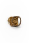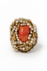 Bague en métal doré, centrée d'un morceau de corail entouré de fils torsadés et de petites perles blanches Signée TDD : 59 Miriam Haskell est une célèbre créatrice américaine de bijoux Haute Couture.