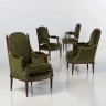 Mobilier comprenant une paire de bergères et une paire de fauteuils à dossier plat, en hêtre mouluré et sculpté, les montants agrémentés de graines, consoles d’accotoirs en cavet cannelé, dés à rosaces, pieds fuselés à cannelures rudentées. Estampille de Nadal l’Ainé. Epoque Louis XVI (Quelques piqures). Garniture de velours vert frappé. Pour les bergères : H 97 × L 60 × P 65cm ; Pour les fauteuils : H 94 × L 58 × P 60cm