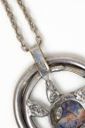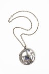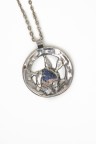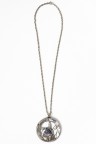 Années 1970 Important pendentif rond en métal argenté, centré d'une pierre dure bleue, retenu sur une chaîne en métal Signé Longueur : 70 cm Diamètre du pendentif : 7,2 cm