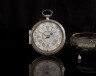 Montre de carrosse. Boîtier en argent gravé et repercé à décor d'un entrelacs de rinceaux feuillagés et coquilles entourant un cartouche à ressauts ; mouvement signé De Scharme London ; poinçon sur la bélière "chimère" pour l'horlogerie importée (1838-1893). Cadran en métal argenté à aiguille simple et aiguille persil en acier, chiffres romains pour les heures, arabes pour les minutes ; mouvement avec coq tête d'homme à l'anglaise à un pied en laiton argenté entièrement gravé et repercé de rinceaux feuillagés et mascaron, piliers en losange, balancier à spirale, échappement à verge ; sonnerie "à la demande" et "au passage" ; réveil. Angleterre, Londres, Scharme horloger, premier tiers du XVIIIe siècle Ø 10,5 cm