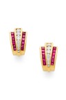Paire de boucles d'oreilles en or jaune 18k (750‰) sertis d'une chute de diamants taille brillant entre deux lignes de rubis calibrés Poinçon de Maître Orfèvre Longueur : 1,5 cm Poids brut 7 g Ecrin signé