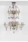 Lustre de forme balustre en verre à douze bras de lumières sur deux rangs à décor polychrome de fleurs, feuillages, et anneaux Milieu du XXe siècle H 112 x D 80 cm Accidents et manques