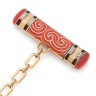 En or jaune 18k (750‰) et platine (850‰) à décor de vagues d'inspiration extrême orientale, émaillé orange et noir, il est rehaussé de diamants taillés en rose et de cabochons de corail pour le poussoir et l'étui de rouge à lèvres.