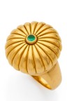Années 1980-90 Originale bague en or jaune 18K (750‰) ornée d'une boule côtelée rotative, une émeraude cabochon à son centre Signée, poinçons de Maître Orfèvre et de titre (un peu effacés) Tdd : 59 Poids brut : 21,5 g