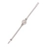 Montre bracelet de dame en or 18k (750). Boîtier rond avec le fond guilloché, couronne de remontoir visible au dos. Cadran argenté avec index bâtons. Mouvement mécanique. Bracelet intégré en or blanc 18k (750).
