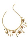 Original collier en or jaune 18k (750‰) retenant au centre 19 charms en pampille dont certains émaillés à décor d'étoiles et d'animaux, tour de cou double chaîne à maillons jaseron