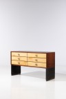 Commode Placage de palissandre, parchemin, bois teinté, placage de bois clair, poignées en laiton doré Edition Arredamenti Borsani, Varedo Modèle créé vers 1930 H 90 x L 160 x P 50 cm