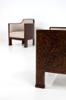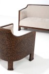 Salon composé d’une banquette, de deux fauteuils et d’une table Pin sculpté teinté et textile Modèle créé vers 1910 Banquette : H 85×L 198×P 66cm Fauteuils : H 78,5×L 64×P 61 cm Table : H 73×L 104,5×P 70cm