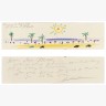 Au recto figure un dessin aux crayons de couleur, légendé à la mine de plomb Cannes, le 29.6.57 / St Pierre et St Paul et au verso, un petit mot manuscrit adressé à Max (Pellequer) signé Picasso concernant l'envoi d'une lettre des contributions.