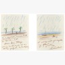 Lettre autographe écrite au crayon de couleur marron, envoyée de La Californie, le 31.10.58 à Mon cher Max, signée au verso en bas à droite Picasso et comportant au recto un dessin aux crayons de couleur représentant un promeneur muni d'un parapluie marchant le long de palmiers sous la pluie et au verso un cycliste suivi de son chien pédalant sur la plage sous la pluie également.