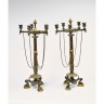 Paire de candélabres en bronze à patine brune à cinq bras de lumières, le fût cannelé reposant sur pieds griffes tripodes. Dans le g...