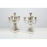 Paire de chandelier à cinq lumières en métal argenté reposant sur une base carrée ornée d'une guirlande de feuilles de laurier à attaches en tête de bélier, le fût en colonne, les branches en enroulement à filets et bobèches à frises de perles