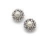 Paire de clips d'oreilles en platine (850‰) et or gris 18k (750‰) à décor rayonnant ornés chacun d'une perle de culture blanche dans un double entourage de diamants ronds Travail des années 1950-60 Poids brut : 16,8 g