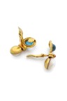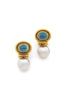Paire de clips d'oreilles en or jaune 18k (750‰) à godrons ornés chacun d'un cabochon de topaze retenant une perle mabé, un rubis serti clos au centre