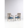 Paire de fauteuils en bois laqué gris et rechampi bleu , dossier ajouré à décor de palmettes, pieds balustres. Fin du XVIIIe siècle.