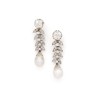 Paire de pendants d'oreilles en or gris 18k (750‰) ornés chacun d'un diamant de taille ancienne de forme ronde et coussin et d'une perle de culture en forme de goutte en pampille retenue par une guirlande de feuillages sertis de diamants