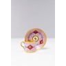 Tasse de forme litron et sa soucoupe en porcelaine à décor en grisaille de coupes et vases dans des losanges à fond rouge se détachant sur un fond rose, galon à fond jaune sur les bords,