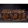 Partie de retable en chêne sculpté en fort relief représentant six apôtres dont saint Jean, saint Pierre, saint Jacques vêtu en pèlerin, un disciple portant une coupe et deux autres sans attributs, chacun étant séparés par des colonnette torsadées et à décor d'écailles. Espagne ?, XVe siècle Hauteur : 44 cm - Largeur : 93 cm (quelques vermoulures et manques)