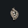 Pendentif "feuille" en or gris 18 k (750°/oo) ajouré, entièrement serti de diamants taillés en rose et de taille ancienne, sept d'entre eux plus importants au centre entre trois petites émeraudes. (Réparations) Hauteur : 3,5 cm Poids brut : 7,7 g Poids total estimé des sept diamants principaux : 1.50/2.00 carat environ.