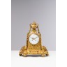 Pendule borne en bronze doré et ciselé, le cadran émaillé en chiffres arabes pour les heures et les quarts, signée "Denière à Paris", surmontée d'une urne drapant une guirlande de fleurs se terminant par une corne d'abondance, reposant sur six pieds toupies. Fin du XIXe siècle. H 47 x L 39 x P 16 cm
