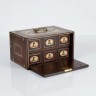Petit cabinet en palissandre et incrustations d'ivoire ouvrant à un abattant qui découvre quatre tiroirs. Décor géométrique avec cartouches ; cornières, poignée sommitale, pendeloques, entrée de serrure en laiton. Indo-portugais, XVIIe siècle H 14 cm x L 25,5 cm x P 17 cm (petites restaurations)
