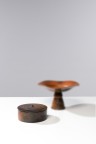 Boîte ronde Terre de faïence blanche, sigillée, engobée puis fumée Modèle créé en 1983 Datée '83' sous la base H 7 × Ø 18 cm